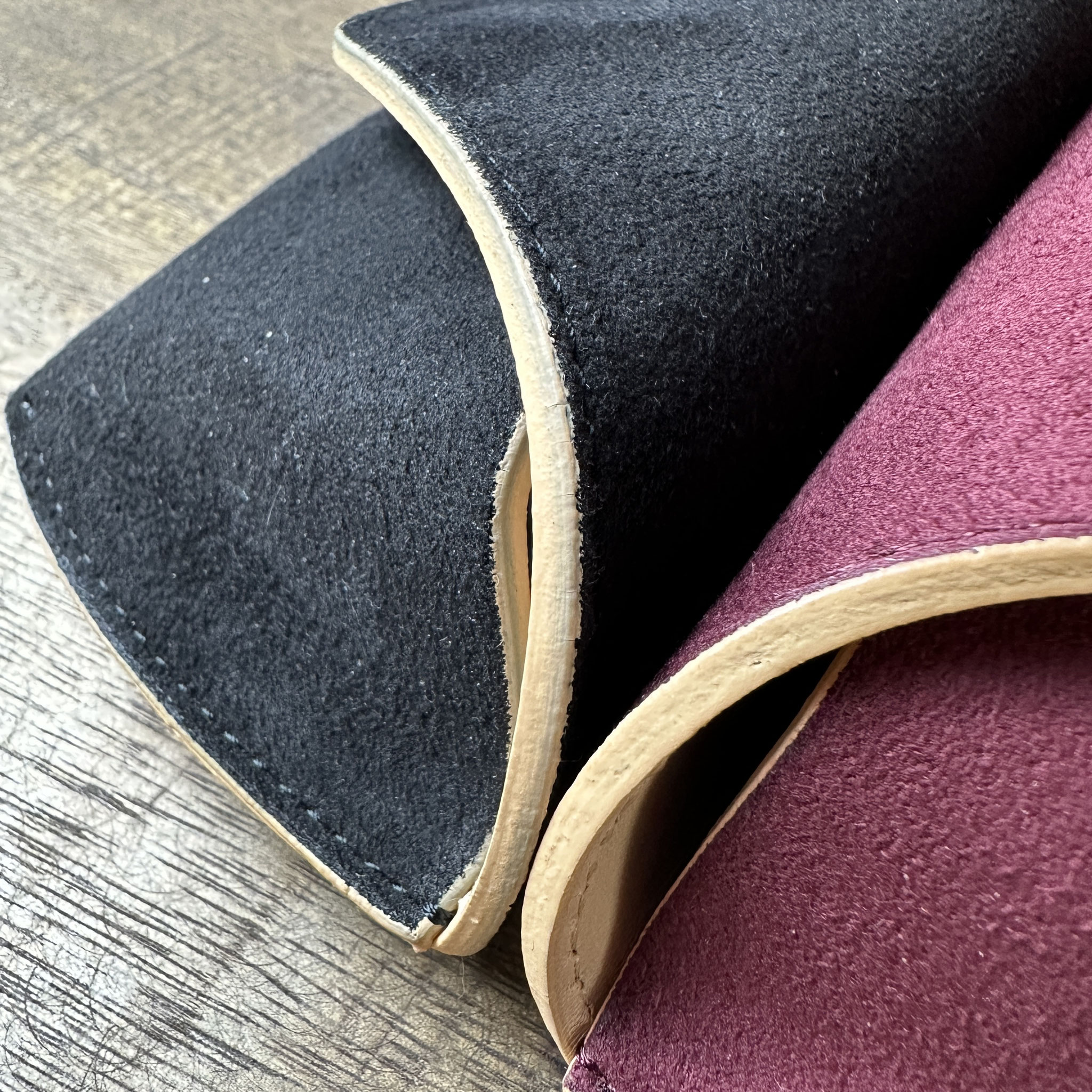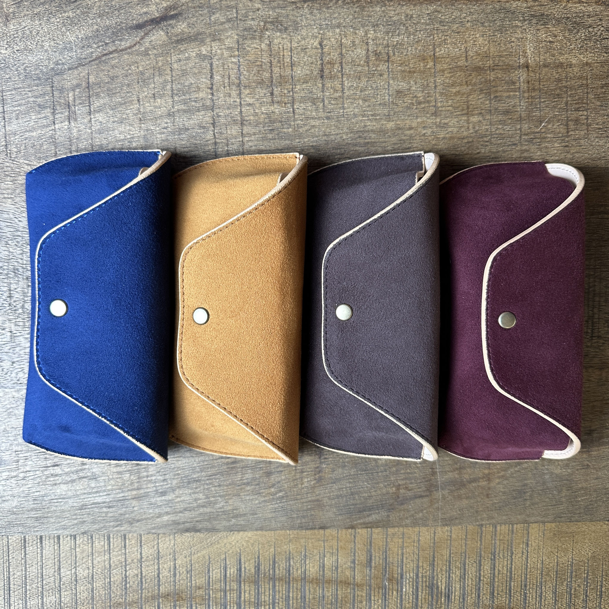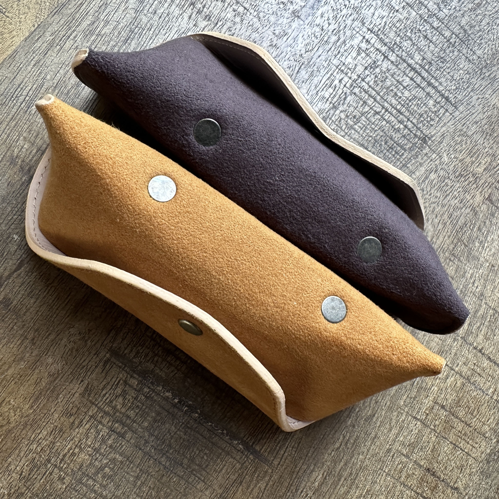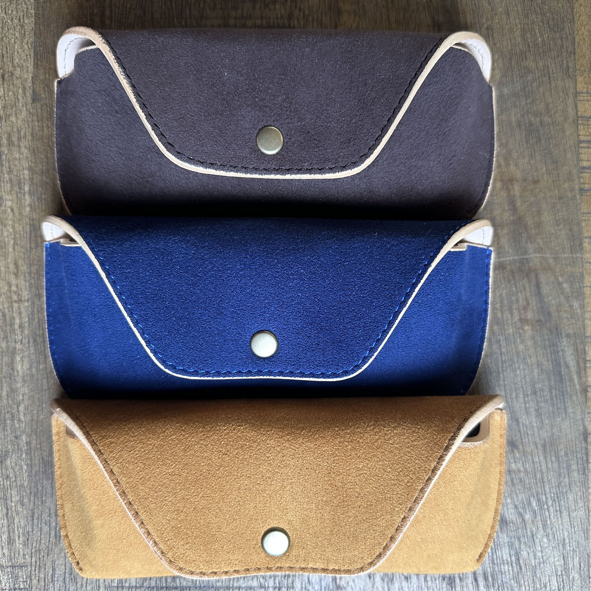 Handgefertigte Brillenetuis von Diffuser Tokyo - Hergestellt aus Ultrasuede der Firma Tora. Ein hochwertiges Kunstwildleder, das für Autoinnenausstattungen, Taschen, Schuhe, Kleidung usw. verwendet und in Japan produziert wird. Echtes Wildleder wird oft wegen möglicher Farbverfärbungen gemieden, doch mit diesem Wildleder müssen Sie sich darüber keine Sorgen machen. Des Weiteren ist das Gewicht deutlich geringer als bei vergleichbaren Lederetuis, die vollständig aus Naturprodukten gefertigt werden.