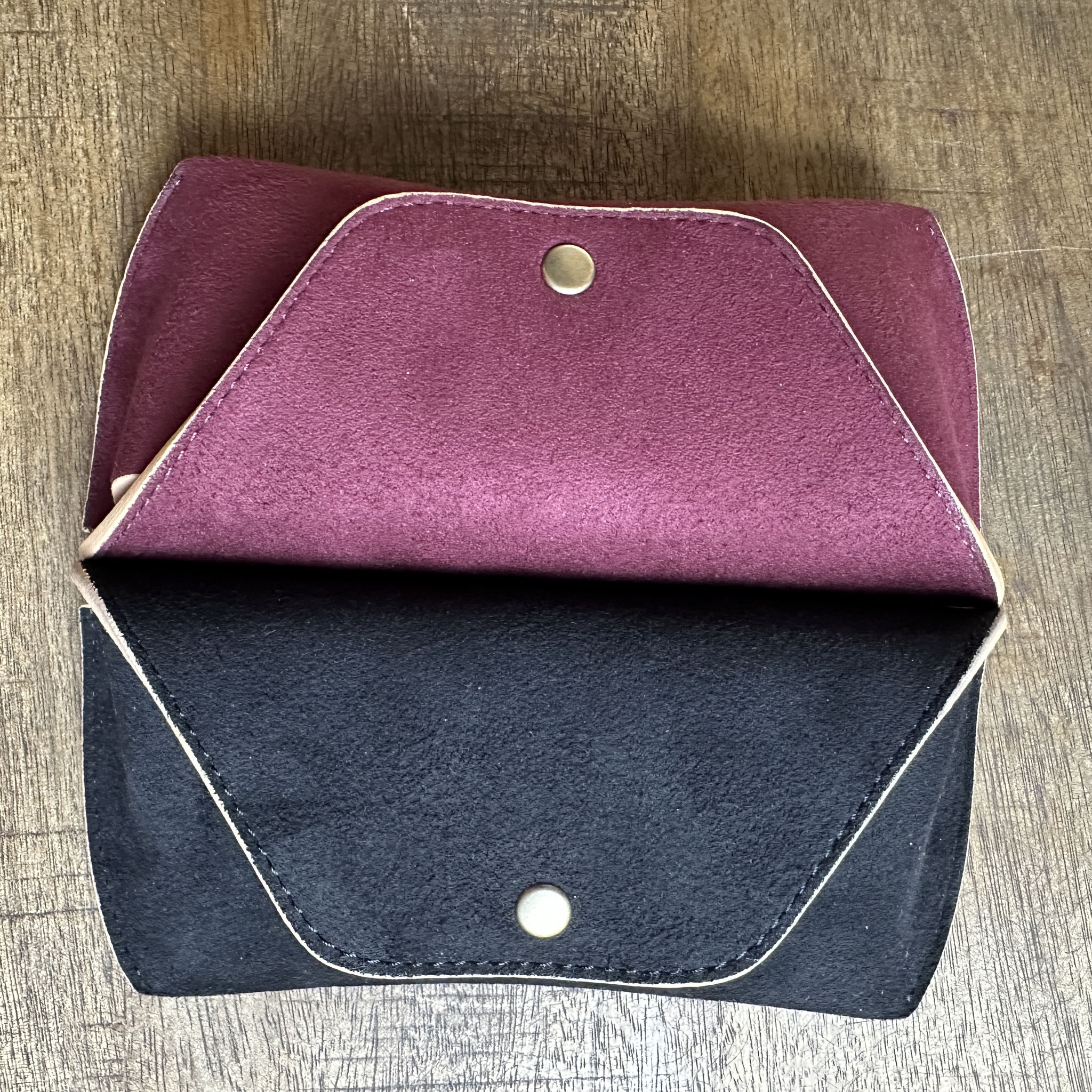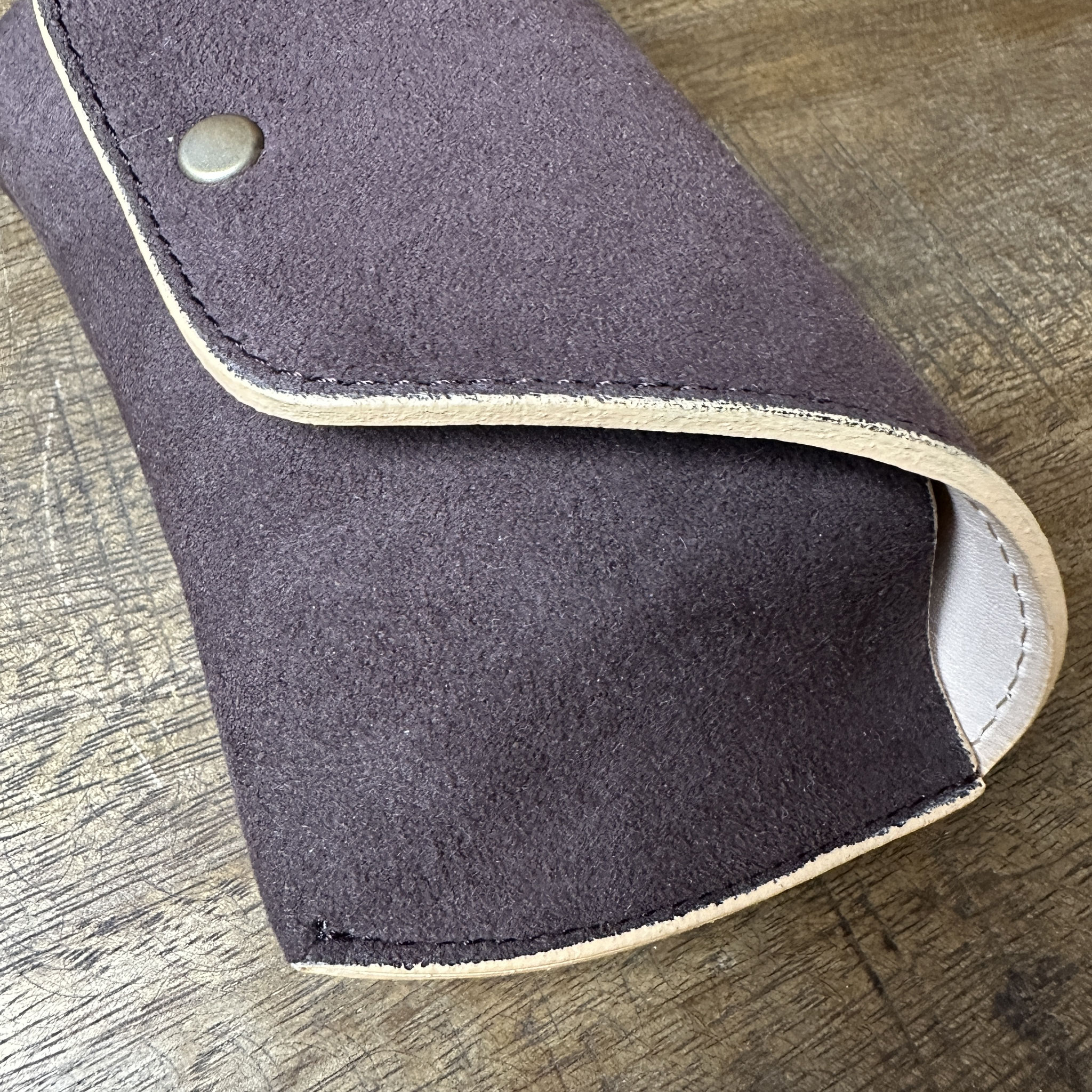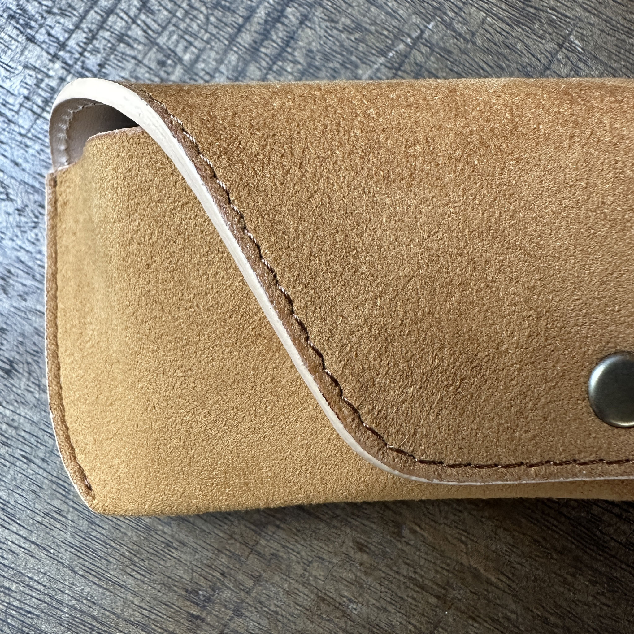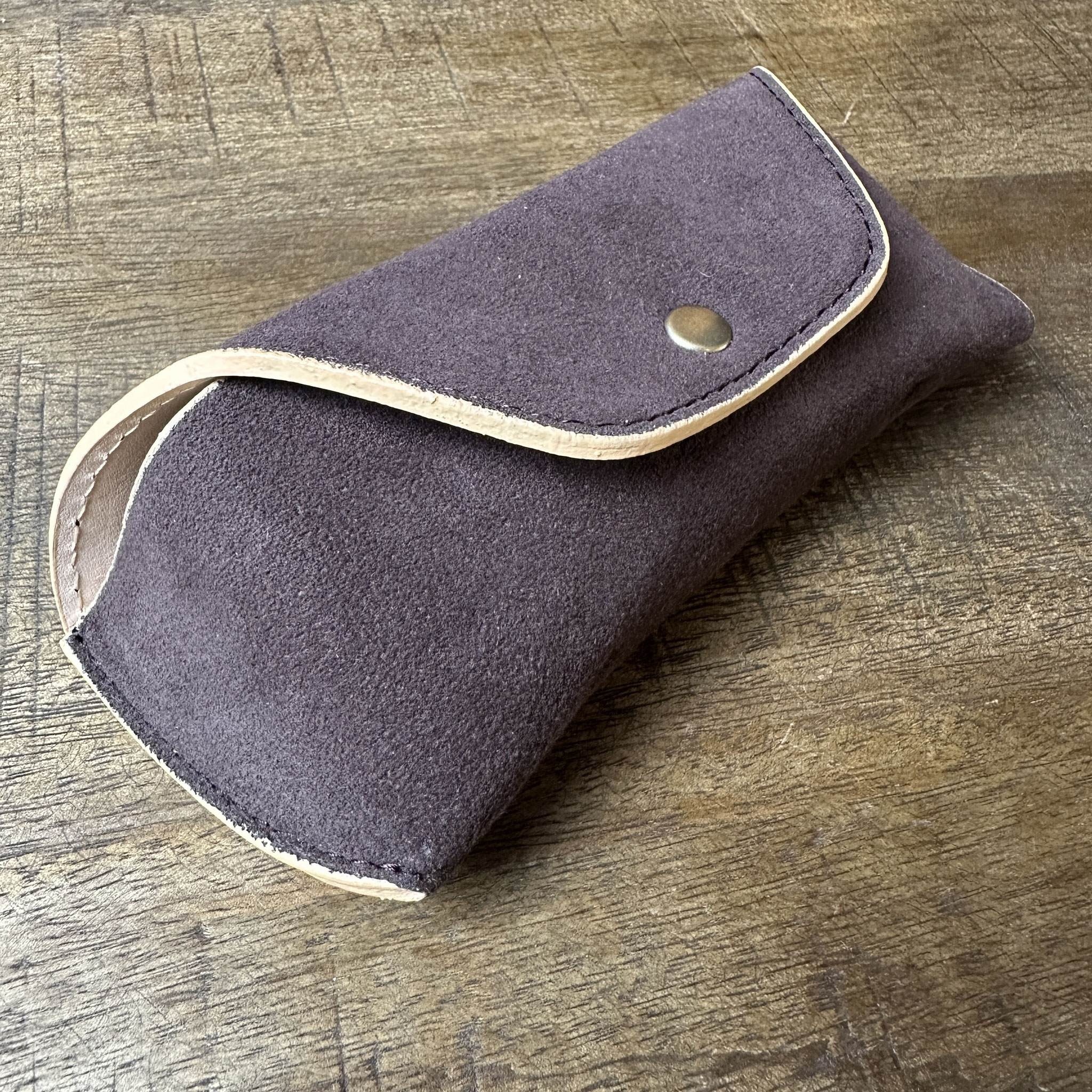 Das Etui kombiniert Kunstwildleder mit gegerbtem Rindsleder zu einer halbharten Struktur und ist in zwei Größen erhältlich, die auf verschiedene Brillengrößen zugeschnitten sind - Ein Messingdruckknopf ermöglicht das einfache Öffnen und Schliessen - Das Etui wird zu 100% in Handarbeit in Japan, nachhaltig produziert.